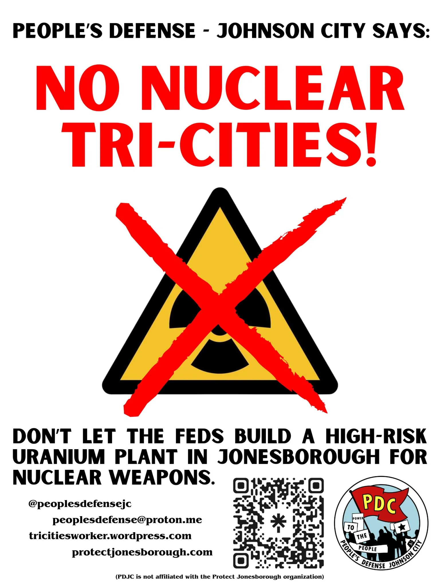 The Washington County Government can restrict BWXT’s development by voting down the re-zoning of a portion of BWXT’s land. But we cannot stop fighting until this entire project is shut down. Tell Washington County Commissioners: “Vote ‘NO’ on BWXT’s M-2 rezoning. Protect our air, water, farms, schools, and families.” Find the call-list, read more, and sign the petition at protectjonesborough.com. Neither The Tri-Cities Worker or PDJC is affiliated with the Protect Jonesborough organization.